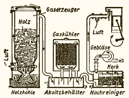È necessario subito volgerci a comprendere per sommi capi il funzionamento d’un gassogeno Imbert. Nel disegno, il cassone cilindrico, Gaserzeuger, è il recipiente entro il quale si versa della legna in trucioli, Holz. In questo caldaio che viene chiuso sopra da un coperchio a tenuta stagna, una piccola apertura permette l’ingresso di un filo d’aria, Luft. Altrettanto da quest’ingresso, tramite un bastoncino acceso a fiamma all’estremità, una sorta di lungo fiammifero, si da fuoco alla massa lignea, da presupporsi sufficientemente asciutta; il fuoco si dovrebbe propagare bene entro lo strato dei trucioli esposti al filo d’aria e di qui si inizia la combustione. Questa però assorbe una quantità d’aria insufficiente per lo svilupparsi d’una fiamma rigogliosa quale conosciamo dai focolari di casa sui quali campano trionfali delle belle pentole in ebollizione, e presto si riduce ad un bruciare di braci che carbonizzano scendendo sotto forma di carbon di legno, Holzkohle, nella parte inferiore del caldaio che, si riconosce dal disegno germanico, è a doppio involucro. Ma in questa soffocata combustione quell’elemento aereo che non potè divenire fiamma perché privo del necessario ossigeno, sprigionatosi dalla legna, altro non è che un gas infiammabile, suscettibile quindi di muovere un motore a combustione interna.